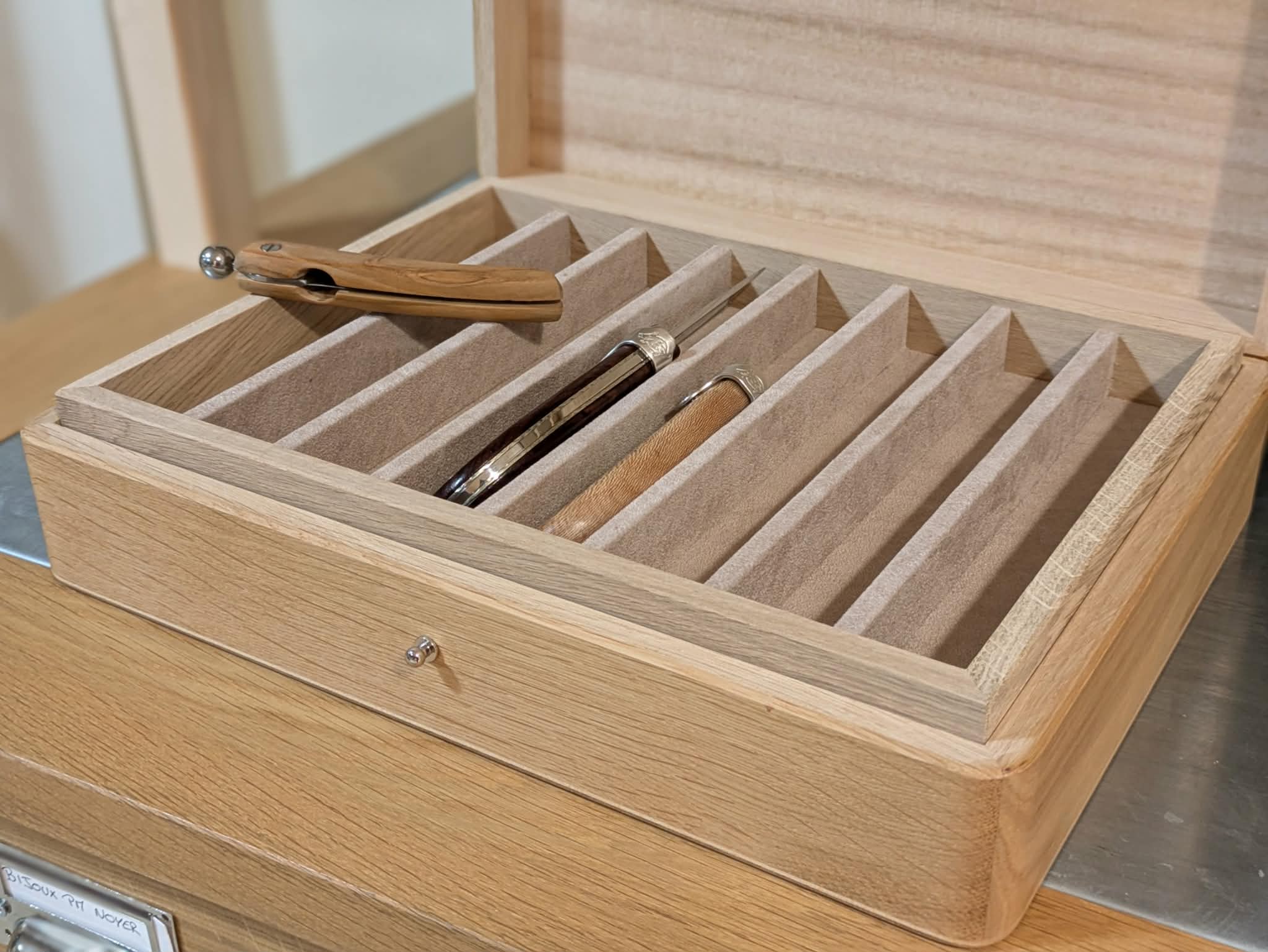 Ce coffret couteau en chêne a été conçu pour accueillir jusqu’à 16 couteaux de collection. Élégant et fonctionnel, cette boîte à couteaux met en valeur vos plus belles pièces tout en les protégeant avec soin.