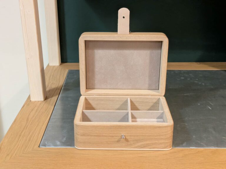 Ce petit coffret à bijoux en chêne, au format délicat et épuré, est fabriqué artisanalement dans le Jura, au cœur d’un territoire riche en savoir-faire. Réalisé en bois massif du Jura, il reflète toute la noblesse d’un matériau local et durable.